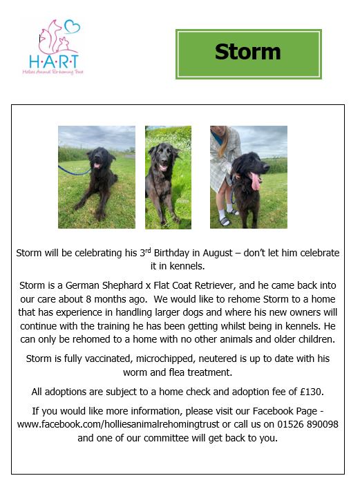 Are you or someone you know looking for a potential new pet? Well let us introduce you to Storm! Read all about him below. If you are interested, please contact us via our Contact Us page or our Facebook page.